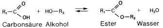 Ester, Klasse von chemischen Verbindungen, die – in formaler Ähnlichkeit zur Salzbildung (Salze) – aus Säuren und Alkoholen unter Bildung von Wasser entstehen. Beispiel: Bildung von Estern aus Carbonsäuren: