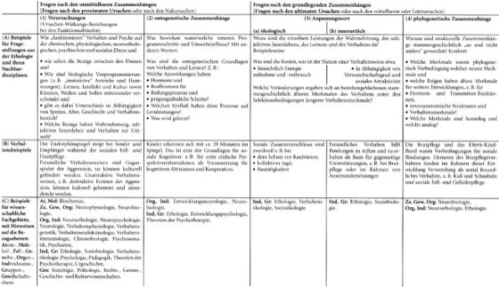 Die vier Grundfragen basieren auf Darwin 1959, Lorenz 1937, Tinbergen 1951; Cl: Bezugsebenen nach Lorenz 1973, C1: Zuordnung der Disziplinen nach Riedl 1980; Verhaltensbeispiele: B1: Bsp.1: Panksepp 1981; Bsp.2: Lorenz 1963, Eibl-Eibesfeldt 1984, Ridley 1997; B2: Bischof-Köhler 1989; B3a: z.B. Krebs & Davies 1984; B3b: Eibl-Eibesfeldt 1984, Goodall 1986, Frank 1988, de Waal 1996; B4: Eibl-Eibesfeldt 1970. – Tabelle nach Medicus 2000.