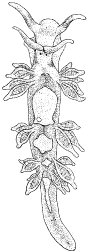 Eubranchusm [von *eu- , griech. bragchos = Kiemen], Gattung der Eubranchidae,Hinterkiemer (Schnecken) mit schlankem Körper, der auf dem Rücken wohlentwickelte, oft kolbenförmige Anhänge (Cerata) trägt ( vgl. Abb. ); Rhinophoren glatt und stabförmig; in Nordsee, Ostatlantik und Mittelmeer mit 11 Arten vertreten; die größte wird ca. 45 mm lang.