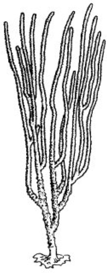 Eunicellaw [Deminutiv zu Eunice], Seefächer, Gattungder Hornkorallen; sie stellen mehr oder weniger verzweigte Polypenstöcke dar, die mehr als 0,5 m hohe Sträucher bilden ( vgl. Abb. ). In den europäischen Meeren sind sie recht häufig. Eunicellaverrucosa, die Warzenkoralle der Nordsee und des Atlantiks, ist orangefarben. Dies beruht auf Carotinoiden, die in den lebenden Zellen eingebettet sind. Deshalb verschwindet die Farbe beim toten Stock. Eunicellastricta (weiß) und Eunicellacavolinii (gelb) sind häufige Mittelmeerarten; letztere bildet besonders große und stark verzweigte Fächer zwischen 15 und 100 m Tiefe. Da die Art sehr attraktiv ist und bei Präparation ihre Farbe behält, ist sie durch Taucher und Sammler gefährdet.