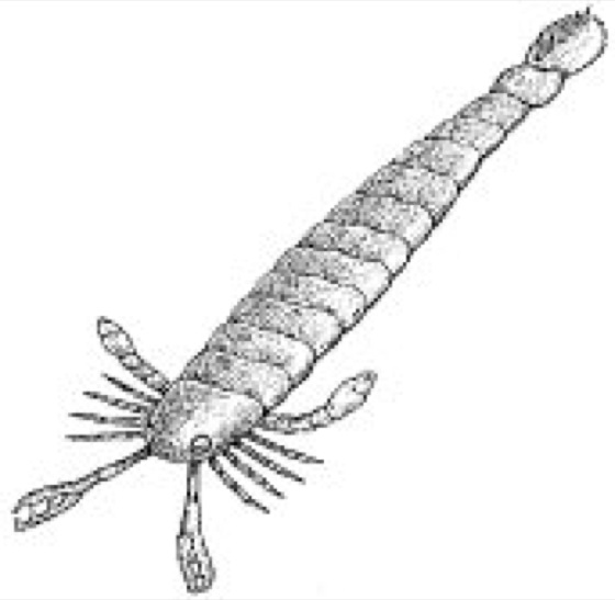 Eurypterida [von *eury- , griech. pteron = Feder, Flosse], (Burmeister 1843), Gigantostraca Haeckel 1896, Riesenskorpione, Seeskorpione, „Riesenkrebse, ausgestorbene Unterklasse wenige cm bis ca. 3 m langer Scherenfüßer (Chelicerata) von skorpionartigem Aussehen ( vgl. Abb. ). Mit annähernd 3 m Körperlänge ist Pterygotus aus dem Devon der größte bekannte Arthropode überhaupt ( vgl. Abb. ). Prosoma relativ klein, Opisthosoma mit 12 beweglichen Segmenten und spitzem bis spatelförmigem Telson. Die 6 Paar prosomaler Körperanhänge bestehen meist aus 1 Paar dreiteiliger Cheliceren, 4 Paar Lauf- und 1 Paar Schwimmbeinen. Mund zentral, hinten begrenzt von Endo- und Metasoma, Operculum mit medianen Genitalanhängen, Abdominalkiemen plattig. Die Riesenskorpione lebten ursprünglich als vagil-benthonische bis nektonische Räuber im Küstenbereich der Meere. Ihre Nachfahren wechselten über in brackische bis limnische Bereiche. Verbreitung: Ordovizium bis Perm. Zu den bekanntesten und bestuntersuchten Vertretern gehört Eurypterus fischeri Eichwald aus dem Silur (Silurium) des Baltikums, dessen 6. Extremitätenpaar in je einem flachen Paddel endete. Chelicerata (Abb.), Paläontologie II.