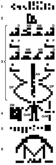 Die Abbildung zeigt die in Form von binär codierten Signalen von einem Radioteleskop (Arecibo, Puerto Rico) 1974 gesendete Botschaft. Dabei bedeuten: