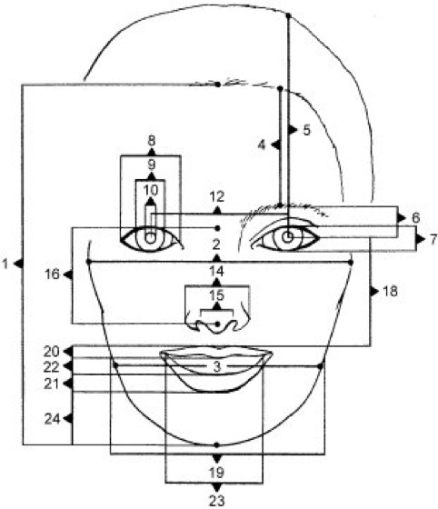 1 Gesichtslänge, 2 Gesichtsbreite auf Wangenknochenhöhe, 3 Gesichtsbreite auf Mundhöhe, 4 Stirnhöhe, 5 Höhe des oberen Kopfteils, 6 Höhe der Augenbrauen, 7 Augenhöhe, 8 Augenbreite, 9 Irisbreite, 10 Pupillenbreite, 11 berechnete standardisierte Pupillenbreite (nicht abgebildet), 12 Augenabstand, 13 berechnete Wangenknochenbreite (nicht abgebildet), 14 Breite der Nasenflügel, 15 Breite der Nasenspitze, 16 Nasenlänge, 17 berechnete Nasenfläche (nicht abgebildet), 18 Länge des mittleren Gesichtsteils, 19 Wangenbreite, 20 Oberlippendicke, 21 Unterlippendicke, 22 Höhe des Lächelns, 23 Breite des Lächelns, 24 Kinnlänge
