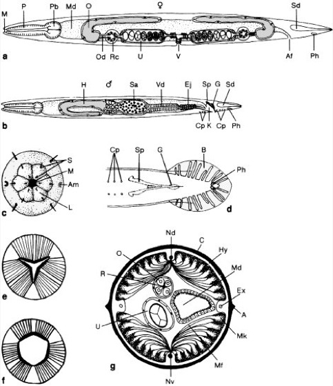 a Seitenansicht eines Weibchens, b eines Männchens (schematisiert); c Vorderende (Frontalansicht); d Schwanzregion eines Männchens (Ventralansicht), eines Vertreters mit Bursa und distal verwachsenen Spicula; e, f Pharynx-Querschnitte, e: Ruhestellung: Pharynx-Lumen eng, f: Saugwirkung: Muskulatur kontrahiert, dadurch Pharynx-Lumen erweitert; g Querschnitt durch mittlere Körperregion eines Weibchens.