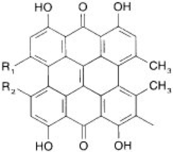 Fagopyrins [von Fagopyrum], Inhaltsstoff des Echten Buchweizens(Fagopyrum esculentum) mit Meso-Naphthodianthren-Grundgerüst ( vgl. Abb. ). Fagopyrin ist verantwortlich für den sog. Fagopyrismus, eine bei hellem und geschecktem Vieh nach dem Verzehr von Buchweizen auftretende, langsame Vergiftung. Symptome sind bei Bestrahlung mit Sonnenlicht auftretende Hautentzündungen sowie Veränderungen des Hämoglobins (Photosensibilisatoren).