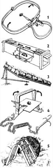 1 Schwanenhals, 2 Kastenfalle, 3 Schlagfalle, 4 Tellereisen (zugeschlagen), 5 Haargreiffalle vor einer Bauröhre