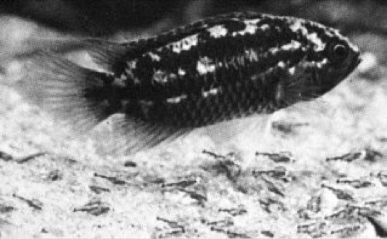 Der gestreifte Zwergbuntbarsch (Nannacara anomala) aus Südamerika pflanzt sich fort, indem das Männchen die Eier besamt, die das Weibchen (Photo) an einen Stein heftet. Die Brutpflege wird dann vom Weibchen übernommen. Es fächelt den Eiern sauerstoffreiches Wasser zu, bewacht sie und führt später die ausgeschlüpften Jungen. Dabei nimmt es eine auffällige Brutpflegefärbung mit weißen Flecken auf schwarzem Grund an. Wenn das Weibchen mit den Jungen schwimmt, bewegt es sich meist langsam und ruckartig. Diese Signale lösen die Nachfolgereaktion der Jungfische aus, die sich eng in der Nähe des Weibchens halten und ihm folgen.