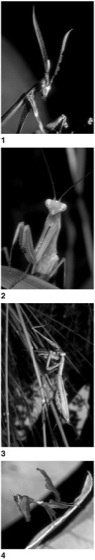 1Empusa pennata, Männchen (Mittelmeergebiet), 2, 3 Gottesanbeterin (Mantis religiosa; Mittelmeergebiet, südliches Mitteleuropa), 4 Larve einer