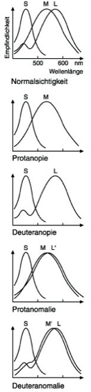 Spektrale Empfindlichkeiten der 3 menschlichen Zapfentypen (oberste Abb.) der Netzhaut und darunter die 4 häufigsten erblichen Störungen des Farbensehens. Die Absorptionsspektren der Zapfen (Wellenlänge λ in nm) sind mit S, M und L bezeichnet, die anomalen entsprechend mit M' und L'. Bei der Protanopie ist das L-Pigment funktionsuntüchtig, bei der Deuteranopie das M-Pigment; die Betroffenen sind dichromatisch. Die Anomalien können unterschiedlich ausgeprägt sein, jedoch ist immer das Empfindlichkeitsspektrum eines Zapfentyps verändert. Oftmals hat dies zur Ursache, daß die Spektren für das M- und L-Pigment sowohl bei der Protanomalie als auch der Deuteranomalie, wie oben gezeigt, näher zusammenrücken.