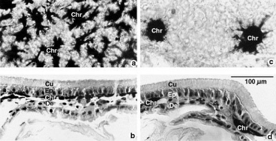 Lichtmikroskopische Aufnahmen der Pigmentverteilung in den Chromatophoren eines Krebses (Fischassel); links: Pigment in den Chromatophoren ausgebreitet – ergibt „dunkel“ (a Aufsicht, b Querschnitt); rechts: Pigment in der Mitte der Chromatophoren konzentriert – ergibt „hell“ (c Aufsicht, d Querschnitt). Chr Chromatophoren, Cu Cuticula, De Dermis, Ep Epidermis