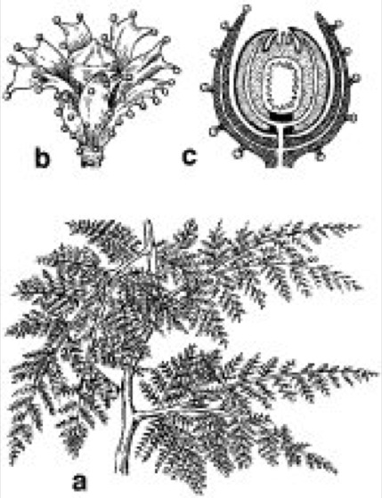 Lyginopteris oldhamia aus dem oberen Karbon: a Rekonstruktion des Stamms mit Laubblättern, b Samen mit Hüllbecher, c Samen im Längsschnitt
