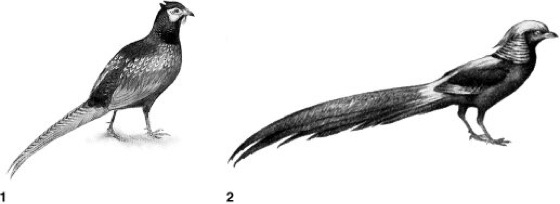 Fasanen [benannt nach dem Fluß Phasis an der Grenze zwischen Kleinasien und Kolchis], Hühnervögel aus der Familie Fasanenvögel mit langem Schwanz und ohne Kamm; Männchen meist sehr farbenprächtig (Sexualdimorphismus); hierzu rechnet auch das asiatische Bankivahuhn (Gallus gallus;Asien VIII ), die Stammform des Haushuhns. Der ursprünglich in verschiedenen Rassen vom Schwarzen Meer bis Ostasien vorkommende Edelfasan oder Jagdfasan (Phasianus colchicus;vgl. Abb. ) ist durch Einbürgerung mit heute etwa 30 Rassen der am weitesten verbreitete Hühnervogel der Erde; er kam von Phasis im Lande Kolchis (Name) nach Südeuropa und wurde von dort durch die Römer nach Deutschland eingeführt; als Jagdtier wird er heute geschätzt und gehegt (Inhaltsstoffe vgl. Tab. ); das bunte Männchen besitzt einen leuchtend grünen Kopf mit einem roten Hautlappen unterm Auge („Rose“), das etwas kleinere Weibchen ist gelbbraun mit dunklen Flecken; lebt als Kulturfolger in buschreichem Wald- und Wiesengelände, bevorzugt in Gewässernähe; sucht abends in der Dämmerung geräuschvoll Bäume zum Übernachten auf. 8–16 olivbraune Eier werden vom Weibchen in 24–25 Tagen ausgebrütet. Von den vielen in Fasanerien als Ziervögel gehaltenen und gezüchteten Fasanen sind besonders bekannt der chinesische Goldfasan (Chrysolophus pictus; vgl. Abb. und Asien III ) undder südostasiatische Silberfasan (Gennaeus nycthemerus; Asien III ). Fährte (Abb.), Glanzfasan; Ritualisierung, Vögel II.