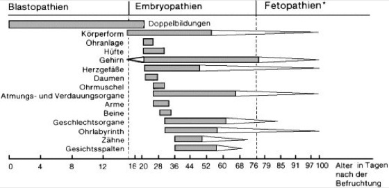 Fehlbildungskalender des Menschen. * Fetopathien können auch noch nach dem 3. Schwangerschaftsmonat ausgelöst werden, z.B. durch Infektionen oder hormonelle Störungen (Kretinismus).