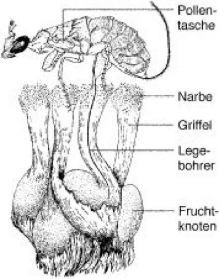 Ceratosolen arabicus bei der Eiablage und Bestäubung einer kurzgriffeligen Blüte von Ficus sycomorus