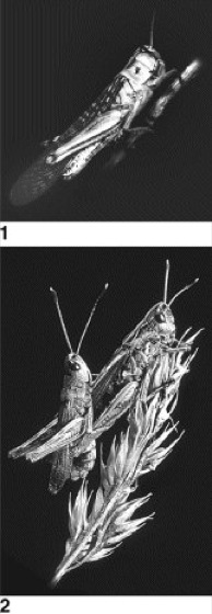 Feldheuschrecken, Acrididae, Kurzfühlerheuschrecken,Kurzfühlerschrecken, weltweit verbreitete Familie der Heuschrecken mit 19 Unterfamilien; umfaßt ca. 6000 Arten, von denen ca. 60 in Mitteleuropa vorkommen ( vgl. Tab. ). Die Feldheuschrecken haben den für Heuschrecken typischen länglichen, seitlich abgeflachten Körper (1–10 cm Länge) mit 2 Paar Flügeln und zum Springen umgestaltete Hinterbeine ( vgl. Abb. ). Sie sind auf Wiesen im Sommer und Frühherbst häufig anzutreffen. Die beiden artenreichsten Unterfamilien Gomphocerinae und Oedipodinae erzeugen Laute, indem die Hinterschenkel rhythmisch gegen die Vorderflügel gerieben werden (Stridulation). Der dabei verwendete Lautapparat dient als Unterscheidungsmerkmal zwischen diesen Unterfamilien: Beim Gomphocerinae-Typ trägt die Innenseite der Hinterschenkel eine Schrilleiste, die aus einer artspezifischen Zahl von artikulierten Zäpfchen besteht. Während der schnellen Auf-Abbewegungen der Hinterbeine streichen die Zäpfchen gegen eine prominente sklerotisierte Ader der Vorderflügel (Insektenflügel), die Vena radialis media. Beim Oedipodinae-Typ sind die lauterzeugenden Komponenten vertauscht: Auf der Innenseite des Hinterschenkels ist eine stark sklerotisierte, glatte Kante, die während der Auf-Abbewegung der Hinterbeine gegen eine Schrillader des Vorderflügels reibt, die Vena intercalata. Sie besteht aus einer Reihe von unregelmäßig geformten Höckern. Schrilleiste bzw. Schrillader sind bei den Männchen durchwegs stärker ausgebildet als bei den Weibchen; Männchengesänge sind deshalb lauter als die der Weibchen. Der Resonanzboden wird von den dachförmig gehaltenen Flügeln gebildet, die über dem Abdomen und der Flügelunterseite einen Freiraum lassen. Die Sumpfschrecke Mecostethus grossus (Unterfamilie Oedipodinae) hat eine vom Oedipodinae-Typ abweichende Lauterzeugung entwickelt. Das Männchen hebt einen der beiden Hinterschenkel an und schleudert die Schiene nach rückwärts. Dabei streifen die Enddornen der Hintertibia über die Zwischenader (Vena intercalata) des Vorderflügels und erzeugen einen an das Knipsen mit den Fingernägeln erinnernden Zick-Laut. Die Zickfolge schwankt zwischen 2–3 Lauten pro Sekunde. Die bei mehreren Gomphocerinae-Arten während des Gesangs durchgeführten elektrophysiologischen Ableitungen am neuromuskulären Bewegungsapparat und die optisch-elektronische Aufzeichnung der Hinterbeinbewegungen haben gezeigt, daß sich die äußerst komplexen stereotypen Bewegungsmuster in raschem Tempo wiederholen. Heuschreckengesänge sind daher ein gutes Beispiel für angeborene auslösende Mechanismen (AAM), die vor allem im Fortpflanzungsverhalten eine wichtige Rolle spielen. Sie sind artspezifisch, und man unterscheidet zwischen einem gewöhnlichen Gesang (Lockgesang) des Männchens und einem Werbegesang (Balz) unmittelbar vor dem Weibchen, ausgelöst durch optische Reize. Der Weibchengesang als Ausdruck erhöhter Paarungsbereitschaft ist schwächer strukturiert als der Männchengesang, versetzt jedoch das Männchen in starke Erregung und ruft Annäherung, Ansprung und Kopulationsversuche hervor. Die Kommunikation zwischen den Geschlechtern bleibt auch intakt, wenn sich infolge eines Temperaturabfalls der Gesangsrhythmus verlangsamt. Das Erkennungszentrum im weiblichen Zentralnervensystem adaptiert sich offensichtlich an die herrschende Außentemperatur. Der bei mehreren Arten der Unterfamilie Gomphocerinae, besonders bei Chorthippus brunneus, auftretende Wechselgesang zwischen 2 Männchen spielt sich in einem losen Rhythmus ab, der jedoch bei weiterer Annäherung plötzlich in eine präzise Anaphonie umschlägt, in denen die Verse verkürzt, laut und schnell alternieren. Solche Rivalenduette können zu kurzen Kämpfen führen. – Feldheuschrecken sind eng an ihren Biotop gebunden. Die Sumpfschrecke Mecostethus grossus ist im Sumpf und auf nassen Wiesen heimisch. Auf trockenen Wiesen findet man mitunter 2–3 Chorthippus-Arten, die sich äußerlich nur wenig voneinander unterscheiden. Bastardierung wird jedoch durch stark unterschiedliche, artspezifische Gesänge vermieden. Die nebeneinander vorkommenden Ödlandschrecken Oedipoda caerulescens und Oedipoda germanica unterscheiden sich dagegen durch ihre blauen bezw. roten Hinterflügel voneinander. Häufig an sonnigen Hängen ist die Schnarrschrecke Psophus stridulus mit leuchtend roten Hinterflügeln, die während des Flugs ein schnarrendes Geräusch erzeugt. Am trockenen Waldrand, aber auch auf alpinen Matten sind Vertreter der Gattung Gomphocerus (Keulenheuschrecken, Keulenschrecken) zu finden, die sich durch eine keulenförmige Verdickung der Antennen auszeichnen ( vgl. Abb. ). Gomphocerus sibiricus fällt auf durch blasenartig verdickte Vordertibien, deren Funktion unbekannt ist. – Alle einheimischen Feldheuschrecken sind Grasfresser. Schädlich werden können bei Massenbefall die unter dem Sammelnamen Wanderheuschrecken zusammengefaßten Gattungen Locusta und Dociostaurus. Beides sind afrikanische Arten, die unter bestimmten Witterungsbedingungen nach Europa verschlagen werden. Duettgesang; Balz I , Insekten I.