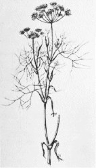 Fenchelm [von latein. feniculum, =], Foeniculum, monotypische Gattungder Doldenblütler mit mehreren Varietäten. Der aus dem Mittelmeergebiet stammende Wilde Fenchel (Foeniculum vulgare var. vulgare) ist eine aromatisch duftende, bis 2 m hohe Staude mit einem dicken, hohlen Stengel, blaugrünen, sehr fein zerteilten, 3–4fach gefiederten Blättern sowie kleinen gelben Blüten, die in Doppeldolden angeordnet sind und längliche, stark gerippte Früchte hervorbringen. Die Blätter und Früchte des Gewürz-Fenchels (Foeniculum vulgare var. dulce; vgl. Abb. ) werden wegen ihres starken, charakteristischen Geschmacks zum Würzen von Speisen bzw. als Tee (Fenchelsamen) verwendet. Der Gemüse-Fenchel (Foeniculum vulgare var. azoricum; vgl. Abb. ) bildet eine bleiche, aus stark verbreiterten und verdickten Blattstielbasen bestehende „Knolle“ und läßt sich als Gemüse oder Salat zubereiten (Inhaltsstoffe vgl. Tab. ). Das insbesondere aus den Fenchelsamen gewonnene etherische Fenchelöl dient zur Herstellung von Arzneimitteln. Aromastoffe, Gewürzpflanzen; Kulturpflanzen VIII.