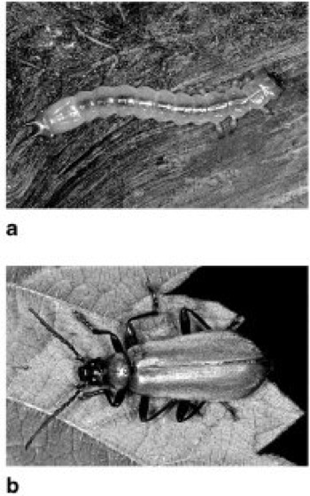 Kardinalkäfer Pyrochroa coccinea,a Larve, b Imago