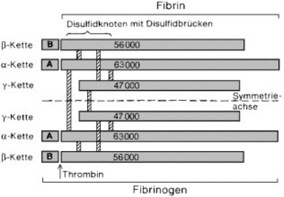Fibrin und dessen Vorstufe, das Fibrinogen (Abb.: Schema eines Fibrinogenmoleküls), sind symmetrisch aus je 2 α-, β- und γ-Peptidketten aufgebaut (die Zahlen geben die relative Molekülmasse der jeweiligen Kette an), die in sog. Disulfidknoten durch Disulfidbrücken kovalent miteinander verbunden sind. Durch die Serinprotease Thrombin werden aus Fibrinogen je 2 Fibrinopeptide A und B von den α- bzw. β-Ketten unter Ausbildung von Fibrin abgespalten. Die Abspaltung der beiden B-Peptide erfolgt erst nach Aggregation der A-freien Zwischenstufe zu den noch lockeren Fibrinbündeln. Die so entstandenen Fibrinmonomere polymerisieren durch nichtkovalente Bindungen der verkürzten α- und β-Ketten. Die kovalente Quervernetzung der auf diese Weise parallel angeordneten Fibrinmonomere unter der katalytischen Wirkung des von Thrombin aus einer Vorstufe aktivierten Blutgerinnungsfaktors XIII (Blutgerinnung) bildet den abschließenden Schritt. Die Quervernetzungen erfolgen durch Ausbildung von Amidbindungen (sog. Isopeptidbindungen) zwischen Aminogruppen von Lysinresten und Carboxylgruppen von Glutaminsäureresten der γ-Ketten benachbarter Fibrin-Moleküle. Das quervernetzte Fibrin bewirkt durch seine Wasserunlöslichkeit den Wundverschluß.