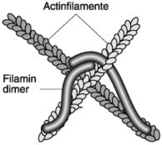 Filamins [von *fila- ], das am häufigsten vorkommende, quervernetzende Actin-bindende Protein (Tab.). Es ist ein langes, flexibles Molekül aus 2 identischen Polypeptidketten, die an ihrem Vorderende miteinander verbunden sind und an ihren Schwänzen je eine Bindungsstelle für ein Actinfilament aufweisen ( vgl. Abb. ). Es ist 160 nm lang und hat einen Durchmesser von 3–5 nm. Filamin vernetzt die Actinfilamente (Abb.) wie ein biegsames Bindeglied. Wirkt auf dieses eine Kraft plötzlich ein, so behält das Actinnetz seine Form bei. Wird die Kraft jedoch langsam und stetig gesteigert, wird das Netz deformiert. Fimbrin.