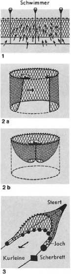 1 Treibnetz, hängt senkrecht, von Schwimmern gehalten, in einer bestimmten Tiefe; Typ der Kiemennetze, in denen sich dagegenschwimmende Fische fangen. 2 Ringwade: das Netz wird von 2 Booten um einen Fischschwarm ausgelegt (a), verschlossen und eingeholt (b). 3 Grundschleppnetz: ein Netzsack, der sich zu einem Beutel (Steert) verschmälert, in dem sich der Fang sammelt.