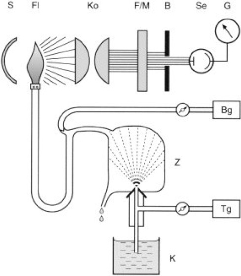 Schematische Darstellung eines Flammenphotometers (B Blende, Bg Brenngas (z.B. Acetylen oder Propan), Fl Flamme, F/M Filter oder Monochromator, G Galvanometer mit Meßwertanzeige, K Küvette mit Analysenlösung, Ko Kondensor, S Spiegel, Se Strahlungsempfänger, Tg Trägergas (z.B. Druckluft), Z Zerstäuber).