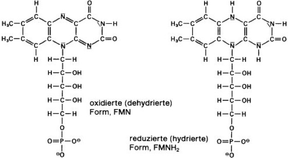 Flavinmononucleotids [von *flavi- ], Riboflavinphosphat, Abk. FMN (oxidierte Form) bzw. FMNH2 (reduzierte Form), bei Redoxreaktionen, die durch Flavinenzyme katalysiert werden, häufig vorkommendes Coenzym ( vgl. Abb. ); z.B. erfolgt die Dehydrierung von NADH (Nicotinamidadenindinucleotid) in der Atmungskette (Abb.) durch die FMN-haltige NADH-Reductase (NADH-Dehydrogenase). Analog zum Flavinadenindinucleotid (Abb.) werden meist 2 Reduktionsäquivalente auf FMN – in selteneren Fällen aber auch einzelne Reduktionsäquivalente über eine halbreduzierte, sog. Semichinon-Form (Semichinone) – übertragen. Die Messung von FMN-abhängigen enzymatischen Reaktionen erfolgt wie bei FAD optisch aufgrund der für FMN charakteristischen Licht-Absorption. FMN bildet sich in der Zelle aus Riboflavin (Vitamin B2) durch ATP-abhängige Phosphorylierung. Theorell (H.A.T.).