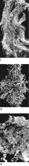 1 Bartflechten an einem Nadelbaumzweig; 2 Strauchflechte, Bandflechte (Pseudevernia furfuracea);3 Laubflechte (Lobaria pulmonaria)