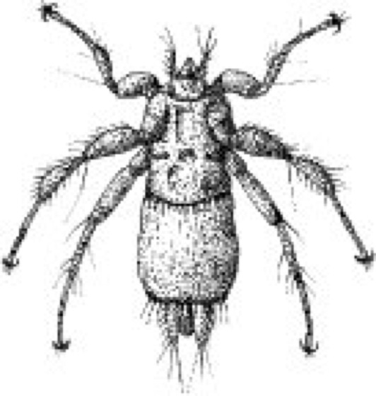 Fledermausfliegen, 2 Familiender Fliegen (Gruppe Deckelschlüpfer), eng verwandt mit den Lausfliegen; gehören wie die Hippoboscidae zu der oft als Lausfliegen (i.w.S.; Pupipara) bezeichneten Gruppe, deren Vertreter verpuppungsreife Larven zur Welt bringen. Die Familie Streblidae umfaßt weltweit 250 Arten, die meisten in den Tropen und Subtropen, vor allem in Amerika; nur Brachytarsina flavipennis Macq. (3 mm) kommt auch in Südeuropa vor; klein, nur wenige mm lang; Kopf normal gestellt (im Gegensatz zu den Spinnenfliegen, s.u.); Komplexaugen stark rückgebildet oder fehlend, keine Ocellen; Flügel gut entwickelt oder rückgebildet; Halteren meist vorhanden; leben als Ektoparasiten blutsaugend ausschließlich auf Fledermäusen (Wirtsspezifität?); durch die extreme Anpassung der Weibchen an die parasitische Lebensweise ist die Gattung Ascodipteron (Australien, Indien, Afrika) bemerkenswert: zunächst voll geflügelt; wirft auf dem Wirt Flügel und Beine ab, bohrt sich mit Hilfe der mit starken Zähnen besetzten Labellen in die Haut ein; verwandelt sich in ein sackartiges Gebilde, das nur noch am Einbohrloch mit dem Hinterende die Außenluft erreicht und hier die Larven abgibt. Die Familie Spinnenfliegen (Nycteribiidae) umfaßt insgesamt ca. 250 meist tropische Arten, in Mitteleuropa etwa 10 Arten von ca. 3 mm Körperlänge. In Anpassung an ihre ausschließlich parasitäre Lebensweise im Fell der Fledermäuse ist der typische Fliegenhabitus extrem abgewandelt. Die Flügel sind vollständig reduziert; Beine lang; Hüften weit dorsal angesetzt, spinnenähnliche Haltung (Name!); Kopf in Ruhehaltung in eine Rinne des Thorax nach hinten zurückgeklappt; die Augen sind meist verkümmert, die Segmente des gedrungenen Körpers verschmolzen. Die langen, weit dorsal ansetzenden Beine und die Borstenkämme am ganzen Körper dienen zum Festhalten im Fell des Wirtes. – Die Fledermausfliegen ernähren sich durch Saugen von Blut. Die Wirtsspezifität ist unterschiedlich ausgeprägt. Nycteribia pedicularia ( vgl. Abb. ) bevorzugt, aber nicht ausschließlich, Myotis-Arten (Mausohr); nach Überwinterung eifriges Bemühen des wenig wählerischen Männchens um das Weibchen (Versuche an falschen Objekten nicht selten); die Kopulation dauert zuweilen mehrere Stunden, das Paar läuft dabei meist umher und kann Purzelbäume nach rückwärts schlagen; Männchen dabei durch Mittelbeine und Borsten auf dem Rücken des Weibchens fixiert; unterstützt mit den Hinterbeinen das Laufen; eine Begattung reicht für mehrere Larvengeburten aus. Eine weitere heimische Gattung ist Penicillidia auf Wasserfledermäusen.