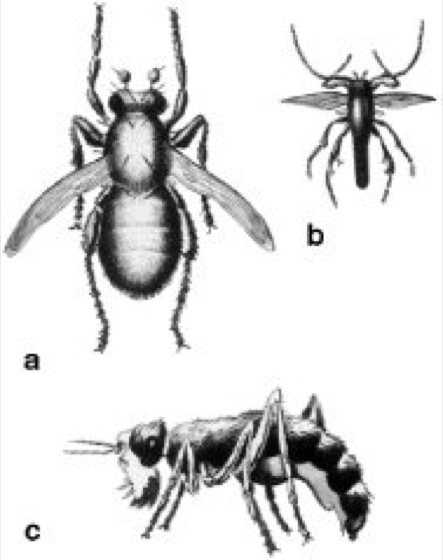 a und c zwei Fliegen der Kerguelen, a noch mit Flügelrudimenten, c Flügel völlig reduziert; b ein Schmetterling mit stark verkürzten Flügeln.