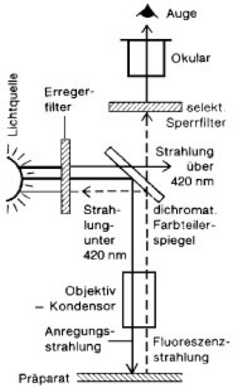 Neben der eben beschriebenen Durchlichtfluoreszenzmikroskopie hat sich in den letzten Jahren immer mehr die Auflichtfluoreszenzmikroskopie durchgesetzt (siehe Abb.). Dabei fungiert das verwendete Objektiv gleichzeitig als Kondensor. Als Illuminatorspiegel dient ein dichromatischer Farbteilerspiegel (Interferenzspiegel), der so konstruiert ist, daß er bei Beleuchtung unter 45° Erregerlicht von kleiner Wellenlänge (λ <420 nm) möglichst vollständig reflektiert, längerwellige Anteile (λ >420 nm) und damit die Fluoreszenzstrahlung jedoch weitgehend passieren läßt. Da diese Eigenschaften in der Praxis nicht voll realisierbar sind, sind zusätzliche Erreger- und Sperrfilter notwendig. (Aus Gründen der Übersichtlichkeit ist die gestrichelte Linie [Fluoreszenzstrahlung] neben die ausgezogene Linie [Anregungsstrahlung] gezeichnet.)