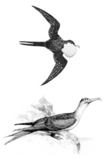 Fregattvögel, Fregatidae, Familiegroßer, zu den Ruderfüßern gehöriger dunkler Vögel tropischer Meere; langer Gabelschwanz und lange schmale Flügel, die exzellente Flugfähigkeiten ermöglichen. 1 Gattung mit 5 Arten, die kolonieweise küstennah in niedrigen Sträuchern und Bäumen nisten; ernähren sich von fliegenden Fischen, jagen aber auch Vögeln, z.B. Tölpeln und Möwen, die Beute ab. Die Flügelspannweite des im Bereich des südlichen Atlantiks und des Pazifiks vorkommenden Prachtfregattvogels (Fregata magnificens, Nordamerika VI) beträgt 2,3 m. Das Männchen besitzt einen fast unbefiederten, leuchtend roten Kehlsack ( ö vgl. Abb. ), der während der Balz ballonartig aufgeblasen wird ( Balz II ). Das einzige kreidefarbige Ei wird von beiden Partnern in 7–8 Wochen ausgebrütet; das nackt und mit geschlossenen Augen geschlüpfte Junge wird 4–5 Monate lang im Nest von den Eltern gefüttert; es legt nach 2 Jahren das Erwachsenenkleid an. Galapagosinseln II .
