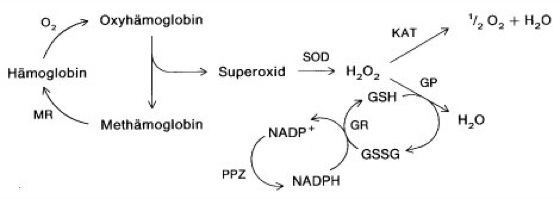 Abb. 4: Schutz der Erythrocyten gegen Sauerstoffschädigungen durch die Oxidation von Hämoglobin. Etwa 3% des menschlichen Hämoglobins werden täglich oxidiert. Neben den dargestellten Schutzmechanismen existiert eine Methämoglobin-Reductase, die Fe(III)-Häm zu Fe(II)-Häm reduziert.