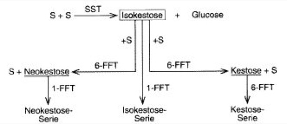 Fructane [von *fruct- ], Fructosane, Polyfructosane, nach Stärke und Saccharose wichtigster pflanzlicher Kohlenhydratspeicher (Polysaccharide). Vorkommen hauptsächlich bei den Korbblütlern, Süßgräsern, Liliengewächsen, Schwertliliengewächsen und Agavengewächsen. Fructane sind leicht wasserlösliche, nichtreduzierende Polyfructosyl-Saccharosen, die aus β-D-Fructose-Einheiten (Fructose) aufgebaut sind. Sie werden in 4 Strukturtypen eingeteilt ( vgl. Abb. 1 ): 1) Isokestose-Serie mit β(1-2)-Bindungen (auch als Inuline [Inulin] bezeichnet, nach Inula helenium,Alant; auch in Helianthus tuberosus, Topinambur, Sonnenblume). 2) Kestose-Serie mit β(6-2)-Bindungen (auch als Lävane oder Phleine bezeichnet, nach Phleum pratense, Wiesen-Lieschgras; auch in anderen Süßgräsern). 3) Neokestose-Serie, ebenfalls mit β(1-2)-Bindungen (zählt auch zu den Inulinen; z.B. bei Asparagus officinalis,Spargel). 4) Verzweigte Fructane mit verschiedenen Bindungstypen; z.B. in Süßgräsern und Agavengewächsen. Biosynthese, Speicherung und Abbau der Fructane erfolgen in der Vakuole. An der Synthese ( vgl. Abb. 2 ) sind 2 Enzyme beteiligt, eine Saccharose:Saccharose-Fructosyl-Transferase (SST) für die Startreaktion und 2 Typen einer Fructan:Fructan-Fructosyl-Transferase (FFT) für die Kettenverlängerungen und die Bildung der β(6-2)-Bindungen. Die Kettenverlängerung findet durch Austausch von Fructose zwischen Fructanketten (einschließlich der Isokestose) statt. Auch manche Hefen und Bakterien synthetisieren und speichern Fructane (relative Molekülmasse über 2.000000). Hierbei ist nur 1 Enzym, die Lävan-Saccharase, beteiligt, die sowohl die SST- als auch die FFT-Reaktion katalysieren kann und als Vorgänger dieser beiden Enzyme der Höheren Pflanzen gilt. Der Abbau der Fructane erfolgt durch Abspaltung terminaler Fructose-Reste durch eine β-Fructosidase (Fructan(exo)-Hydrolase; bei Inulinabbau auch Inulinase genannt). Die Depolymerisierung wird durch Fructose-Transfer von langen auf kurze Fructanketten (FFT-Reaktion) unterstützt. Fructane fungieren als Speichersubstanzen in überdauernden Knollen, Rüben und Rhizomen (z.B. Topinambur, Alant, Zichorie [Cichorium]), in den Sprossen von Süßgräsern sowie in Blättern (Lauch, Zwiebel, Agave, Süßgräser). Fructane finden verschiedene Anwendungen: diätetischer Lebensmittelzusatzstoff, Gewinnung von Fructose mittels Hefe-Inulinase, Vergärung zu Alkohol (Topinambur, Agave: Tequila), Zichorie-Kaffee, als chemischer Rohstoff. 1998 gelang es niederländischen Wissenschaftlern, Zuckerrüben (Beta) durch Übertragung des entsprechenden Gens aus der Topinambur zur Synthese von Fructanen zu veranlassen (gentechnische Freilandexperimente).