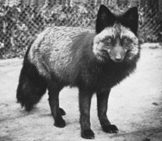 Abb. 2: Der Silberfuchs (Silberschwarzfuchs), eine hauptsächlich in Nordamerika und Nordostsibirien vorkommende schwarze Farbvarietät des Rotfuchses (Vulpes vulpes), wird in speziellen Pelztierfarmen gezüchtet.