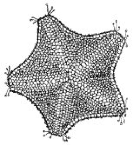 Fünfeckstern, Asterina gibbosa, Seestern von ungewöhnlicher Gestalt ( ü vgl. Abb. ): die 5 Arme ragen kaum über die Scheibe hinaus; Durchmesser 5–6 cm; in Seegraswiesen und auf Felsböden bis 130 m Tiefe, Atlantik und Mittelmeer; einer der wenigen zwittrigen Seesterne (konsekutiv, selten auch simultan). Namengebend für die Familie Asterinidae, zu der auch der Gänsefußstern und Netzstern gehören.