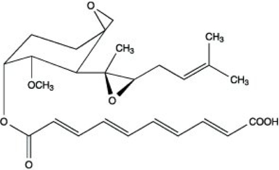 Fumagillins, von dem Schimmelpilz Aspergillus fumigatus gebildetes Polyen-Antibiotikum (Polyenantibiotika; vgl. Abb. ), das die Angiogenese und das Wachstum von Tumoren hemmt. Aufgrund seiner guten antitumoralen Wirkung und seiner guten Verträglichkeit wird die Verwendung von Fumagillin in der Tumortherapie, aber auch bei anderen Erkrankungen, bei denen die Angiogenese eine wichtige Rolle spielt, in Erwägung gezogen. Mit Hilfe einer synthetischen Variante von Fumagillin konnte das Wachstum von Kaposi-Sarkom-Zellen (Kaposi-Sarkom) in Zellkultur beeinträchtigt und die Angiogenese in wachsenden Kaposi-Sarkomen gehemmt werden. Angioinhibine.