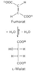 Reaktion der Fumarase; Fumarat und Malat = ionische Formen von Fumarsäure bzw. Apfelsäure