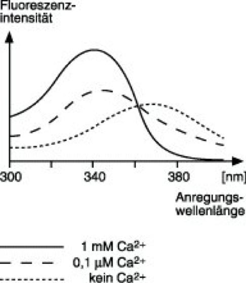 Fura-2, ein Fluoreszenzfarbstoff (Fluorochrome), der zum Nachweis freier Ca2+-Ionen (Calcium) verwendet wird. Fura-2-Moleküle bilden mit freien Ca2+-Ionen einen Chelatkomplex (Chelate). Im Gegensatz zu einigen anderen calciumsensitiven Fluoreszenzfarbstoffen reagiert Fura-2 auf eine Erhöhung der Ca2+-Konzentration nicht nur mit einer höheren Fluoreszenzintensität. In Abhängigkeit der Ca2+-Konzentration vergrößert und verschiebt sich bei diesem Farbstoff das Intensitätsmaximum der Fluoreszenzstrahlung (Fluoreszenz), d.h., daß für jede Ca2+-Konzentration eine andere Wellenlänge des Anregungslichts (Anregung) ein Intensitätsmaximum erzeugt ( vgl. Abb. ). Dies ist vor allem deshalb von Vorteil, weil die Intensität des Fluoreszenzlichts selber bereits durch Faktoren wie die Beleuchtungsintensität, die effektive optische Dichte des Materials sowie die Farbstoffkonzentration beeinflußt wird. Wird einer Lösung mit unbekannter Ca2+-Konzentration Fura-2 zugesetzt, und wird diese Lösung anschließend mit Licht unterschiedlicher Wellenlänge bestrahlt, so gibt die Maximumslage des Intensitätsverlaufs in Abhängigkeit von der eingestrahlten Lichtwellenlänge Auskunft über die Ca2+-Konzentration. Fura-2 zeichnet sich im Vergleich zu anderen Fluoreszenzfarbstoffen durch eine bessere Selektivität gegenüber Magnesium- und Schwermetallionen aus. Zur intrazellulären Bestimmung räumlicher Calcium-Verteilungen und deren zeitlicher Entwicklung wird ein Fura-2-Ester in die Zelle eingeschleust. Eine Esterase setzt das Fluoreszenzmolekül, für das die Zellmembran undurchlässig ist, wieder frei. Mittels der Fluoreszenz-Korrelations-Spektroskopie kann der Ca2+-Gehalt bis hinab zu einer Konzentration von 10–15 Mol/l bestimmt werden.