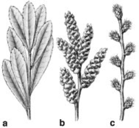Gagelstrauch (Myrica gale):a Blätter, b staminater und c karpellater Blütenstand (annähernd maßstäblich)
