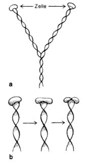 Gallionella ferruginea,a Teil eines dichotom verzweigten Stiels, b Teilung der Bakterienzelle an der Spitze des Stiels
