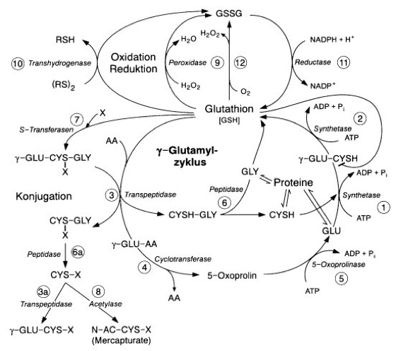1: γ-Glutamylcystein-Synthetase, 2: Glutathion-Synthetase, 3 und 3a: Glutamyl-Transpeptidase, 4: γ-Glutamylcyclo-Transferase, 5: 5-Oxoprolinase, 6 und 6a: Dipeptidase, 7: GSH-S-Transferase, 8: N-Acetylase, 9: GSH-Peroxidase, 10: Transhydrogenase, 11: GSSG-Reductase, 12: direkte GSH-Oxidation, AA: Aminosäuren, X: Substanzen, die mit GSH Konjugate bilden können.