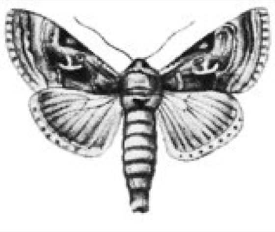 Gammaeule [von *gamma- ], Autographa (Phytometra, Plusia) gamma, häufiger einheimischer Eulenfalter, weltweit verbreitet, düster grau bis violett braun gefärbt, mit auffälligem gammaähnlichem silbrigem Ornament auf den Vorderflügeln ( vgl. Abb. ), Spannweite um 40 mm. Die Gammaeule ist tag- und nachtaktiv, fliegt auf Wiesen, Äckern, Gärten und Ödländereien; eifriger Blütenbesucher, gerne an Rotklee, Flockenblumen, Skabiosen und anderen Pflanzen; bekannter Wanderfalter; im Frühsommer fliegen Falter aus Südeuropa zu uns, deren Nachkommen die individuenreiche Spätsommergeneration bilden. Raupe unterschiedlich gefärbt, meist grün mit hellen Punkten und Streifen, vordere Bauchfüße reduziert; Bewegung daher ähnlich den Spannerraupen; an verschiedenen krautigen Pflanzen, manchmal an Kulturpflanzen schädlich; Verpuppung in lockerem Gespinst an der Futterpflanze.
