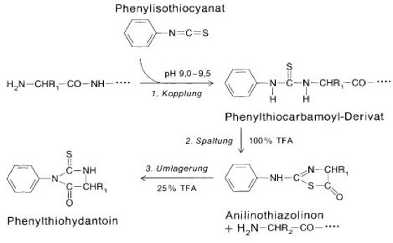 Prinzip des Edmanschen Abbaus, wie er auch im Gasphasen-Sequenator bei der Peptidsequenzierung abläuft (TFA = Trifluoressigsäure).