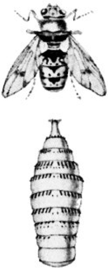 Pferdemagenbremse (Gasterophilus intestinalis), Männchen und Larve