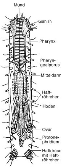 Gastrotricha [von *gastro- , griech. triches = Haare], früher Ichthydina, Bauchhaarlinge, Flaschentierchen, ausschließlich frei lebende, mikroskopisch kleine Würmer (0,05–1 mm, maximal 4 mm), die ebenso in Süßgewässern wie in Litoral und Sublitoral aller Meere weltweit verbreitet sind. Sie sind von stab- bis flaschenförmiger Gestalt mit meist deutlich abgesetztem rundlichem Kopf, der beidseits lange, an Schnurrhaare erinnernde Sinnescilien und häufig kleine, öhrchenförmige Sinnestentakel trägt. Die Bauchseite ist zu einer Kriechsohle abgeplattet und besitzt in Längs- oder Querreihen stehende Cilienbänder, auf denen die Tiere außerordentlich rasch gleitend zu kriechen und mit denen sie auch kurze Strecken zu schwimmen vermögen. Das Hinterende ist meist gegabelt in 2 Zehen (Furca) mit Klebdrüsen (Klebröhrchen) an ihrer Spitze, mit deren Hilfe die Tiere sich blitzschnell an ihrem Substrat, etwa Sandkörnchen, festheften können. Gegenüber den besonders in strömungsarmen Süßgewässern vorkommenden Chaetonotida mit nur 2 Zehendrüsen besitzen die ausschließlich marinen, meist in bewegterem Wasser lebenden Macrodasyida über die ganze Körperoberfläche verteilt, vor allem an den Flanken, ganze Batterien von bis zu 200 solcher beweglicher Klebröhrchen, die es ihnen auch gestatten, egelartig zu kriechen. Der gesamte Körper ist von einer mehrschichtigen Cuticula überzogen, die besonders dorsal zu einem kompliziert gebauten Schuppenpanzer verdickt sein oder ein bizarres Stachel- oder Dornenkleid bilden kann. Die Gastrotricha sind fast ausschließlich farblos transparent. Sie ernähren sich von einzelligen Blau-, Kiesel- und Grünalgen sowie Bakterien und scheinen großenteils ausgesprochene Nahrungsspezialisten zu sein. Nur einzelne Arten leben planktisch; ihr Hauptlebensraum sind die Oberflächen von Wasserpflanzen und schlammig-sandigen Gewässerböden, ebenso die Lückensysteme der obersten Sedimentschichten (Psammal; Psammon). Die etwa 400 bisher bekannten und weltweit verbreiteten Arten verteilen sich auf 2 Ordnungen ( vgl. Tab. ) mit je 6 Familien, die ursprünglicheren und ausschließlich marinen Macrodasyida unddie auch süßwasserbewohnenden Chaetonotida mit der in all unseren Süßgewässern überaus verbreiteten Gattung Chaetonotus ( vgl. Abb. 1 ), deren Arten zu den kleinsten Mehrzellern überhaupt gehören und die wegen ihrer geringen Größe (deutlich kleiner als ein Pantoffeltierchen) meist übersehen werden. – Anatomie ( vgl. Abb. 2 ): Unter der vielschichtigen Lipoprotein- oder Glykoproteincuticula folgt eine bei manchen Arten syncytiale, meist aber zelluläre Epidermis aus dorsal sehr flachen, ventral und lateral aber hochprismatischen Zellen. Die Flimmerzellen der Kriechsohle sind bei manchen Arten monociliär (Gnathostomulida). Vor allem dorsal findet man zwischen die Epithelzellen eingestreut einzellige Schleimdrüsen; Abkömmlinge der Epidermiszellen sind ebenfalls die zweizelligen Klebdrüsen, deren 2 Zelltypen auf nervösen Reiz hin unterschiedliche Sekrete freisetzen, die nach Art eines Zweikomponentenklebers erst nach dem Zusammentreffen ihre Klebwirkung entfalten. Unter der Epidermis folgt jenseits einer dünnen Basallamina die Rumpfmuskulatur, bei Macrodasyida ein geschlossener, einschichtiger Ringmuskelschlauch und innerwärts mehrere, je nach Art ventrolaterale oder dorsale lamellenartig flache Längsmuskelzüge. Bei den Chaetonotida sind Ring- und vor allem Längsmuskulatur bis auf geringe Reste rückgebildet. Neben überwiegend schräggestreiften Muskelzellen beobachtet man bei einigen Formen auch quergestreifte Muskulatur, deren Feinbau sich jedoch von der Skelettmuskulatur Höherer Coelomaten deutlich unterscheidet (Gnathostomulida). Der Darmtrakt durchzieht den Körper als gerades Rohr, wie bei Fadenwürmern (Nematoden) in nur 2 deutliche Abschnitte gegliedert und bis auf Speicheldrüsen im Vorderabschnitt ohne jede Drüsenanhänge. Die endständige, gewöhnlich unbewehrte Mundöffnung ist von Cilien umsäumt und führt in einen muskulösen Schlund (Pharynx). Die Nahrung wird entweder durch peristaltische Schluckbewegungen eingesogen oder durch die Mundcilien eingestrudelt; einige räuberische Arten können ihre Beuteorganismen auch mit ausstülpbaren, manchmal mit Stacheln bewehrten Pharynxlappen aktiv ergreifen. Der Pharynx besitzt wie bei Fadenwürmern ein im Querschnitt dreieckiges Lumen und eine Wandung aus hochprismatischen Myoepithelzellen mit radiär angeordneten Myofibrillen. Er arbeitet so als Saugpumpe. Bei den Macrodasyida wird das mit der Nahrung aufgenommene Wasser durch 2 Pharyngealporen nach außen geleitet. Sie durchbrechen die Körperwand und münden beidseits am Pharynxende nach außen. Mittel- und Enddarm sind unbewimpert; sie bestehen aus wenigen Reihen mit Mikrovilli besetzter Zellen und sind in ganzer Länge von 2 Muskellagen umkleidet (Macrodasyida), umgekehrt wie bei der Rumpfmuskulatur von einer inneren Ringmuskellage und äußeren Längsmuskelzügen. Der After liegt ventral unmittelbar vor dem Körperende. Beidseits des Darms sind zwischen Rumpf- und Darmmuskulatur Reste einer Leibeshöhle erhalten, die besonders bei den Macrodasyida vonden Muskelschichten epithelartig umkleidet werden. Deshalb deuten manche Autoren sie als Coelomrudimente (Muskelschichten evtl. Derivate eines ehemaligen Coelothels), die dann auf eine Coelomatenabkunft der Gastrotricha und der ihnen nächstverwandten Tiergruppen hinwiesen. Entsprechend der geringen Größe fehlt den Gastrotricha ein Gefäßsystem, während die Exkretion und Osmoregulation über Protonephridien erfolgen, die bei den Macrodasyida als jeweils paarige Organe mit je mehreren Terminalzellen über die ganze Körperlänge verteilt, bei den Chaetonotida auf ein Protonephridienpaar im vorderen Körperbereich mit langgewundenen Ausfuhrkanälen und je einer Exkretionsöffnung reduziert sind. Das Nervensystem gleicht in mancher Hinsicht dem der Plattwürmer (Plathelmint