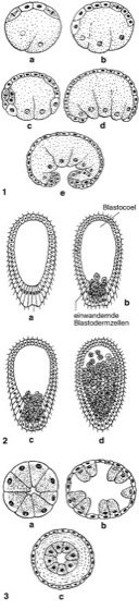 Verschiedene Typen der Gastrulation: 1a–eEpibolie bei der marinen Pantoffelschnecke Crepidula; die vegetalen Makromeren werden von den animalen Mikromeren umwachsen und bilden später das Entoderm. 2a–dImmigration bei der Larve der Hydromeduse Aequorea;a Coeloblastula; b–d vom vegetalen Pol wandern einzelne Zellen ins Blastocoel ein; sie bilden später durch Spaltbildung das Entoderm. 3a–cDelamination bei der Hydromeduse Geryonia (Rüsselqualle); die Zellen des späteren Entoderms werden durch Zellteilungen senkrecht zur Oberfläche ins Innere des Keims verlagert; zwischen Ektoderm und Entoderm bildet sich später die gallertige Mesogloea (gestrichelt in c)
