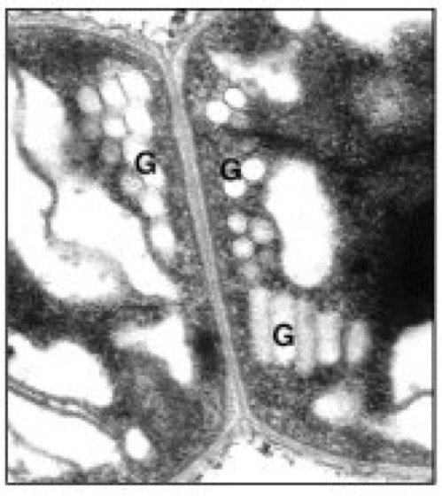 Abb. 1: Elektronenmikroskopische Aufnahme (Negativkontrast) von Prochlorothrix hollandica mit längs- und quergeschnittenen, nebeneinander liegenden Gasvesikeln (G).