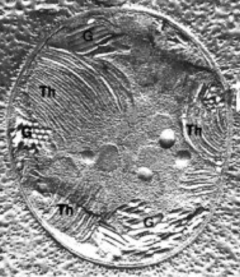 G Gasvakuolen, Th Thylakoide (Photosyntheseapparat).