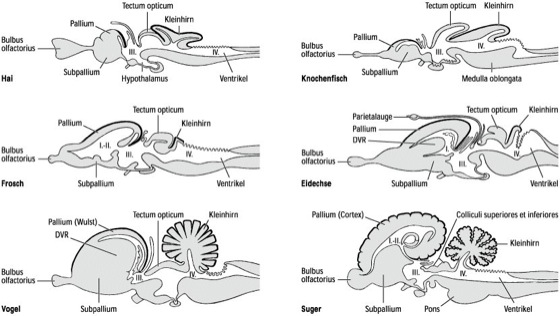 Abb. 2: Längsschnitte durch die Gehirne verschiedener Wirbeltiere. Das Pallium (Hirnmantel) bildet die dorsal und lateral gelegene äußere Schicht des Telencephalons; es heißt bei Säugern Cortex cerebri, bei Vögeln nennt man einen Teil des Palliums auch Wulst. Die darunterliegenden telencephalen Hirnregionen nennt man Subpallium. Ein prominenter, z.T. abgesetzter Bereich des Subpalliums des Reptilien- und Vogelgehirns wird dorsaler ventrikulärer Kamm (dorsal ventricular ridge, DVR) genannt. Die Oberfläche von Pallium und Kleinhirn ist jeweils durch einen dicken Strich hervorgehoben. Die römischen Zahlen bezeichnen die Ventrikel.