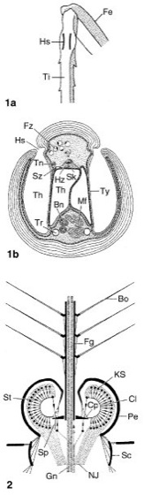 Bn Beinnerv, Bo Borsten, Cl Chitinlamelle, Cp Chitinplatte, Fe Femur, Fg Fühlergeißel, Fz Fettzelle, Gn Geißelnerv, Hs Hörspalt (Öffnungsschlitz der Tympanalhöhle), Hz Hüllzelle. KS Kerne der Sinneszellen, Mf Muskelfaser, NJ Nerven des Johnstonschen Organs, Pe Pedicellus (2. Fühlerglied), Sc Scapus (1. Fühlerglied), Sk Skolops, Sp Skolopidium, St Stift, Sz Sinneszelle, Th Tympanalhöhle, Ti Tibia, Tn Tympanalnerv, Tr Trachee, Ty Tympanum,